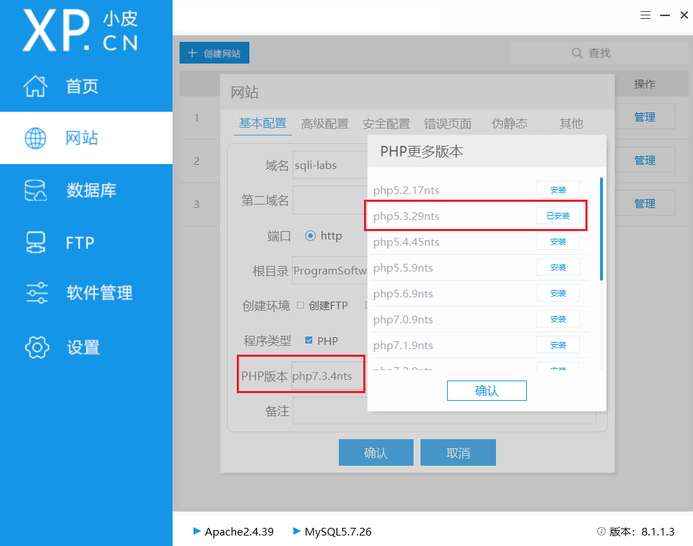 主要是设置好用户名和密码,主机设置本地就可以了。接着创建网站,操作流程和DVWA靶场一样,就是php版本需要设置到5版本,否则会报错: