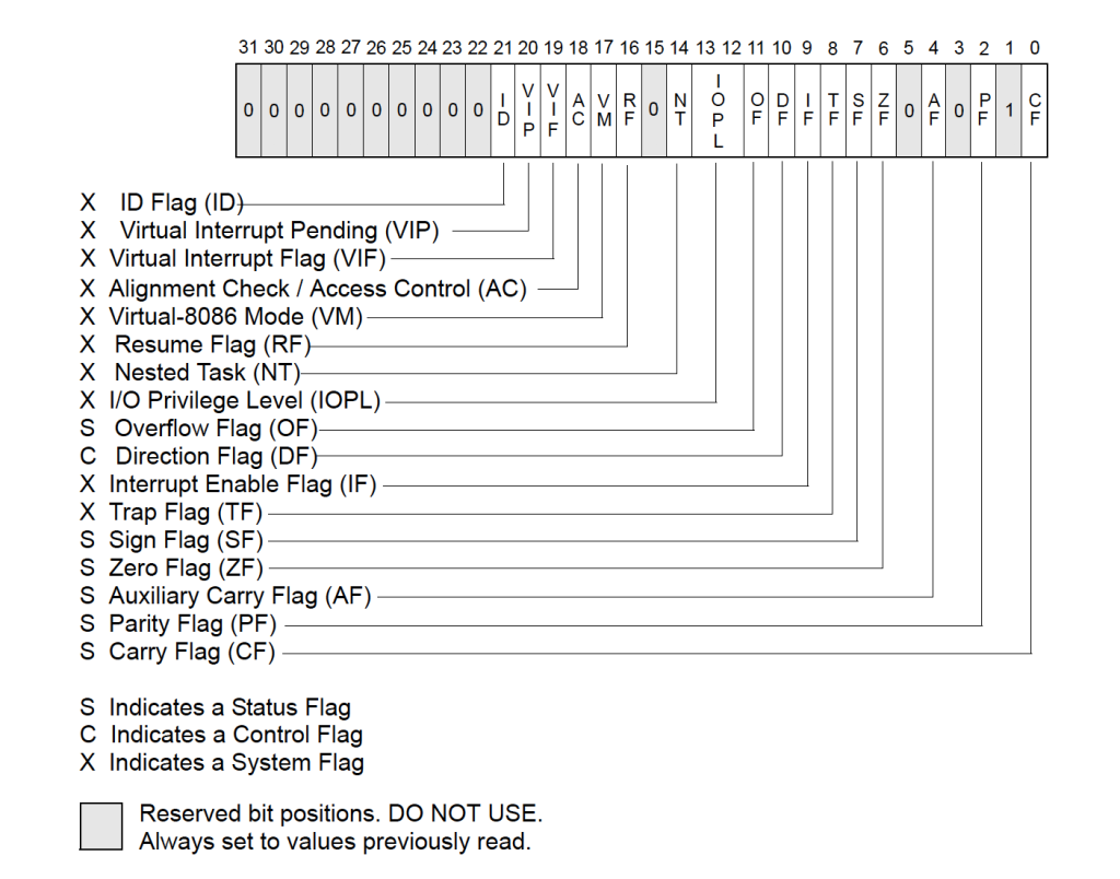 EFLAGS标志寄存器是按位取用,每一位都表示一个标志: