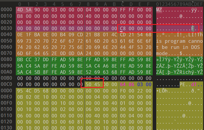 PE文件头(PE File Header)是PE文件的核心标识部分,也被称为NT头,由PE签名标准PE头可选PE头三部分组成,NT头跟在DOS Stub的后面,在_IMAGE_DOS_HEADER结构的e_lfanew元素(0x3C位置处),存了PE头的偏移量。