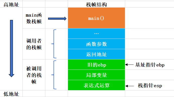 栈帧的起点是栈底,通常使用ebp寄存器指向,也就是基址指针;栈帧的终点是栈顶,通常使用esp寄存器指向,也就是栈指针。栈通常是由高地址向低地址增长的,所以栈底的地址最高,栈顶的地址最低。