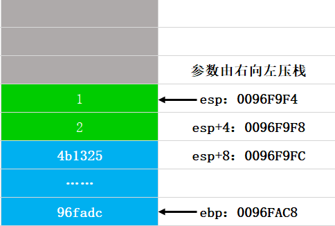 第十五步:ret返回,相当于pop eip指令,执行完后esp指向了当时传入的实参,这个图和实参压栈的图是一样的: