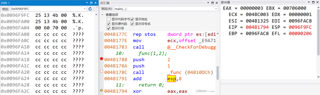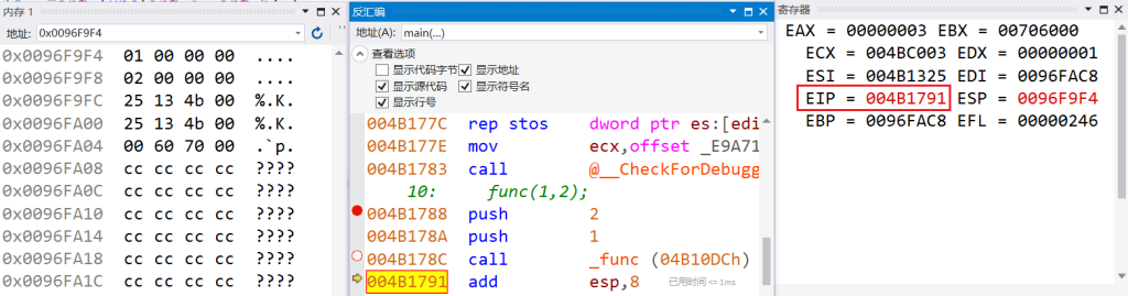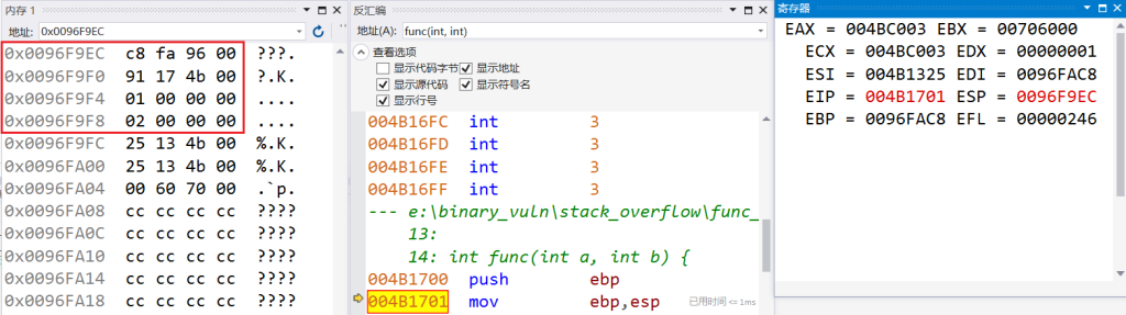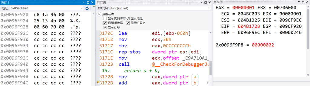 打开VS2017,int func函数前添加一个断点,以X86架构为例,按F5开始调试,打开调试-窗口-反汇编即可看到具体的汇编代码和函数调用栈细节: