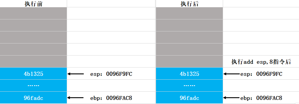 第十六步:此时还没有结束,因为此时的栈状态和压栈之前不一样,我们需要手动调成一样的,然后发现ret返回的下一条指令add esp,8,用于调节esp指针,保持堆栈平衡: