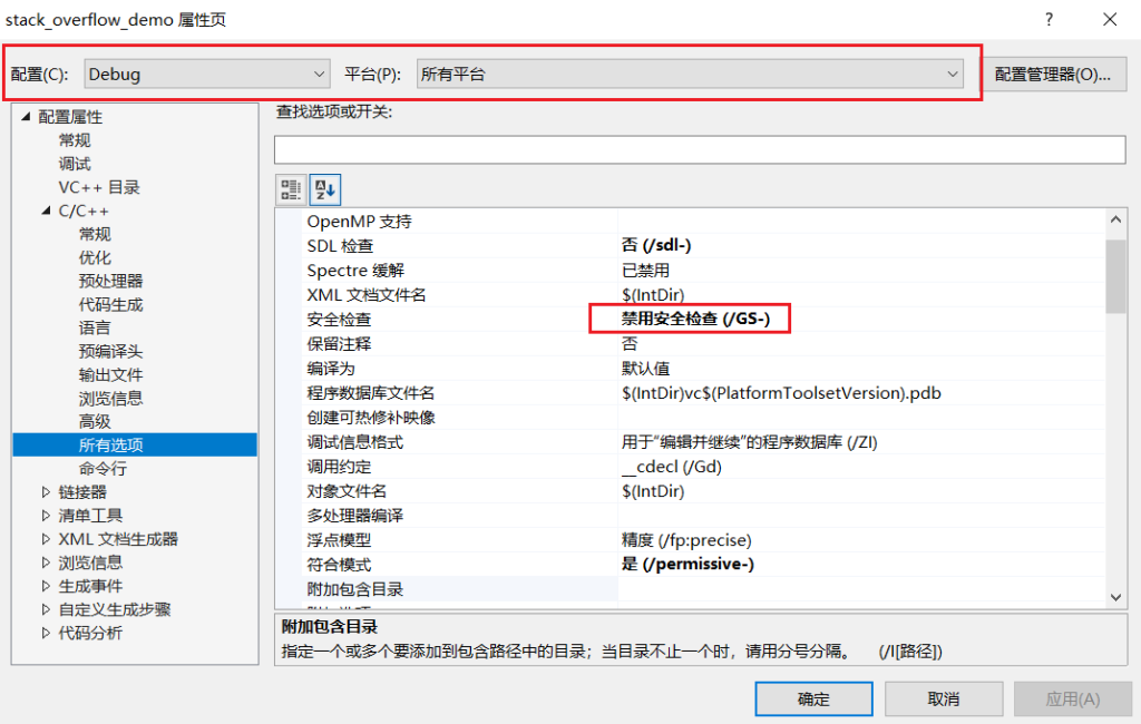 打开VS新建一个C/C++项目,输入上面的代码,注意在调试之前需要关闭栈保护机制和随机地址(ASLR)选项,否则会执行失败;右键项目-属性-C/C++-所有选项-禁用安全检查(GS):