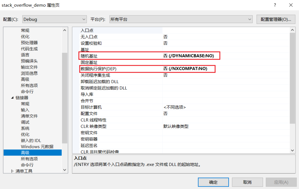 右键项目-属性-链接器-高级-随机地址选择否、数据执行保护(DEP)也选择否: