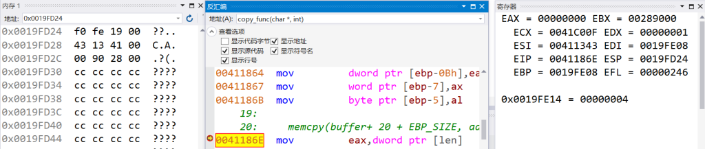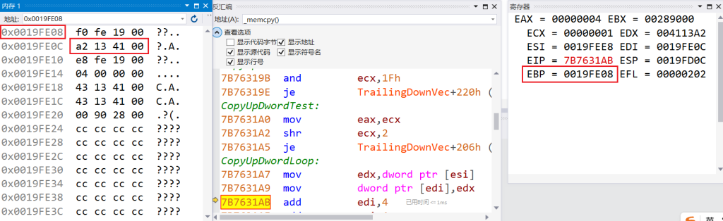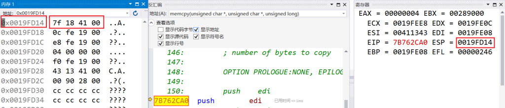 进入memcpy函数,内存窗口输入esp,即可看到返回地址压栈: