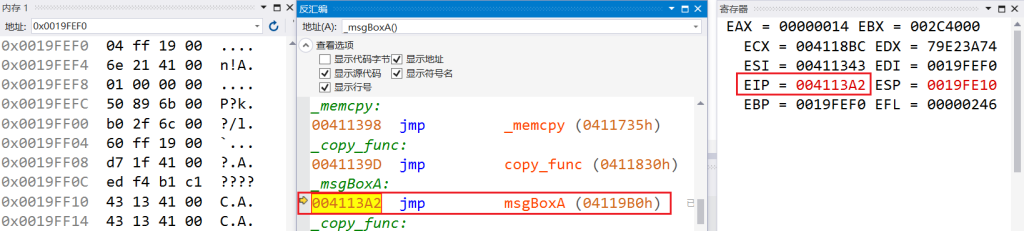 memcpy函数返回后(执行完ret指令),EIP将变成msgBoxA函数的地址,跳到msgBoxA函数执行: